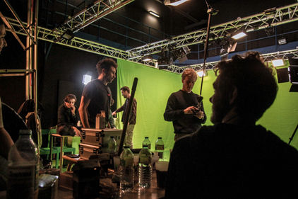 Pour ce tournage sur fond vert à 360°, nous avons eu besoin : ~110 mètres carrés de fond vert que nous avons suspendu sur un grill, ~10 mètres carrés de vinyle vert pour le sol, de panneaux LED, une chaise et une table qu'on a peinte en vert.
